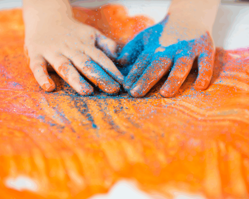 手でこねたり、色を重ねたり、素材を思いきり散らかしたりする中で、言葉にならない気持ちを自由に表すことができます。