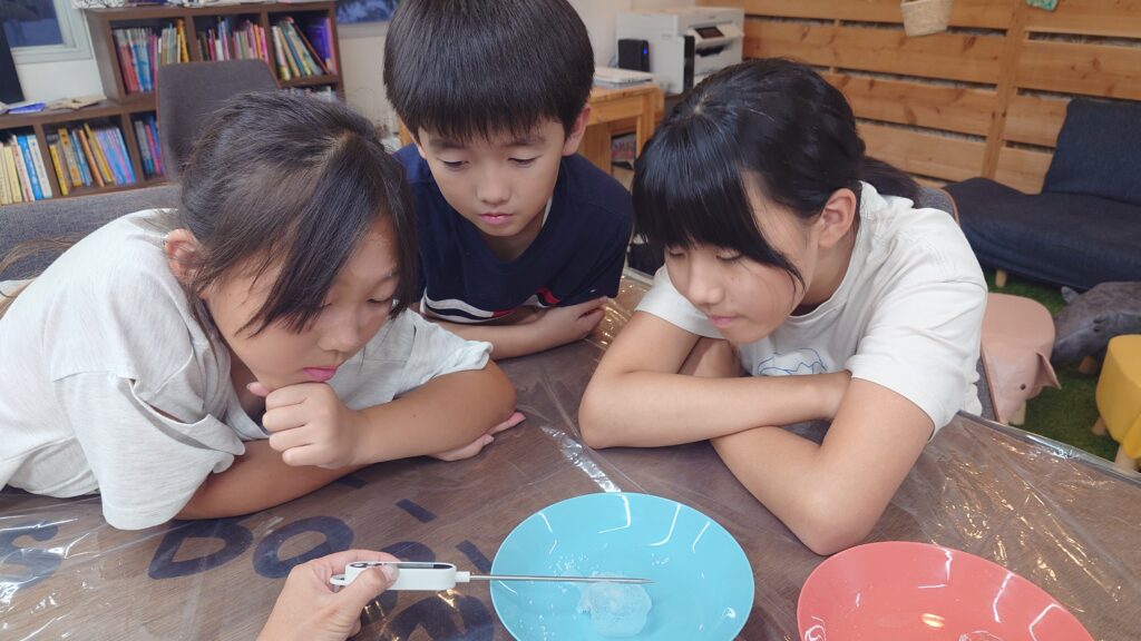 子ども達は氷と塩を入れた方がぐんぐん温度が下がっていく様子をみとてもびっくりしていました。