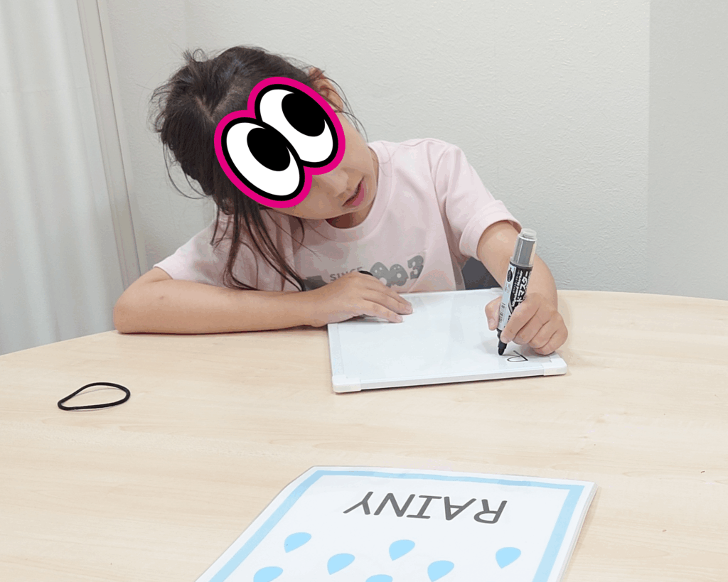 じゃあ、「sunnyでもいいと思うよ。」と伝えると、うれしそうにホワイトボードにSunny, Wednesday, October 1st.と書いてくれました。