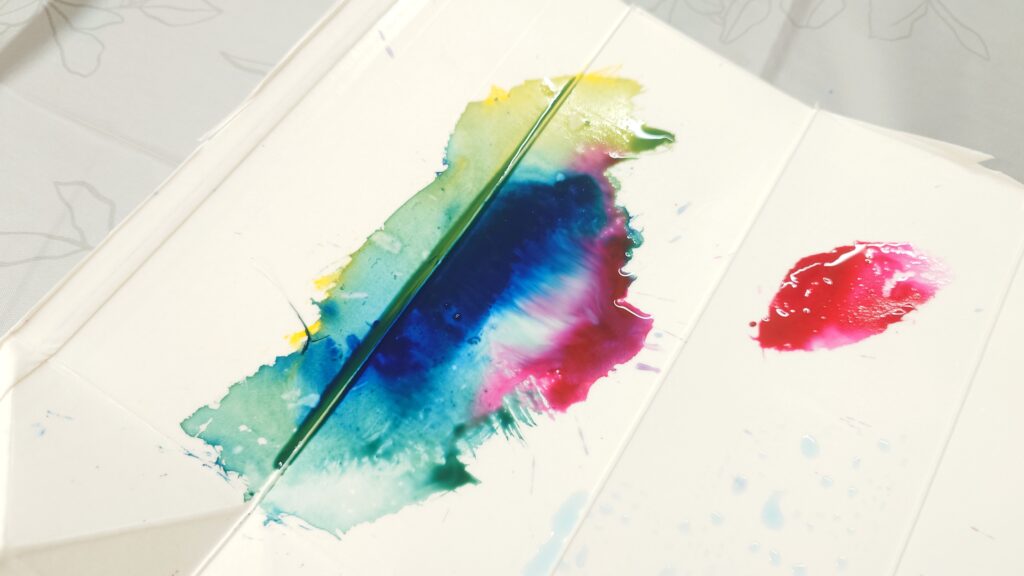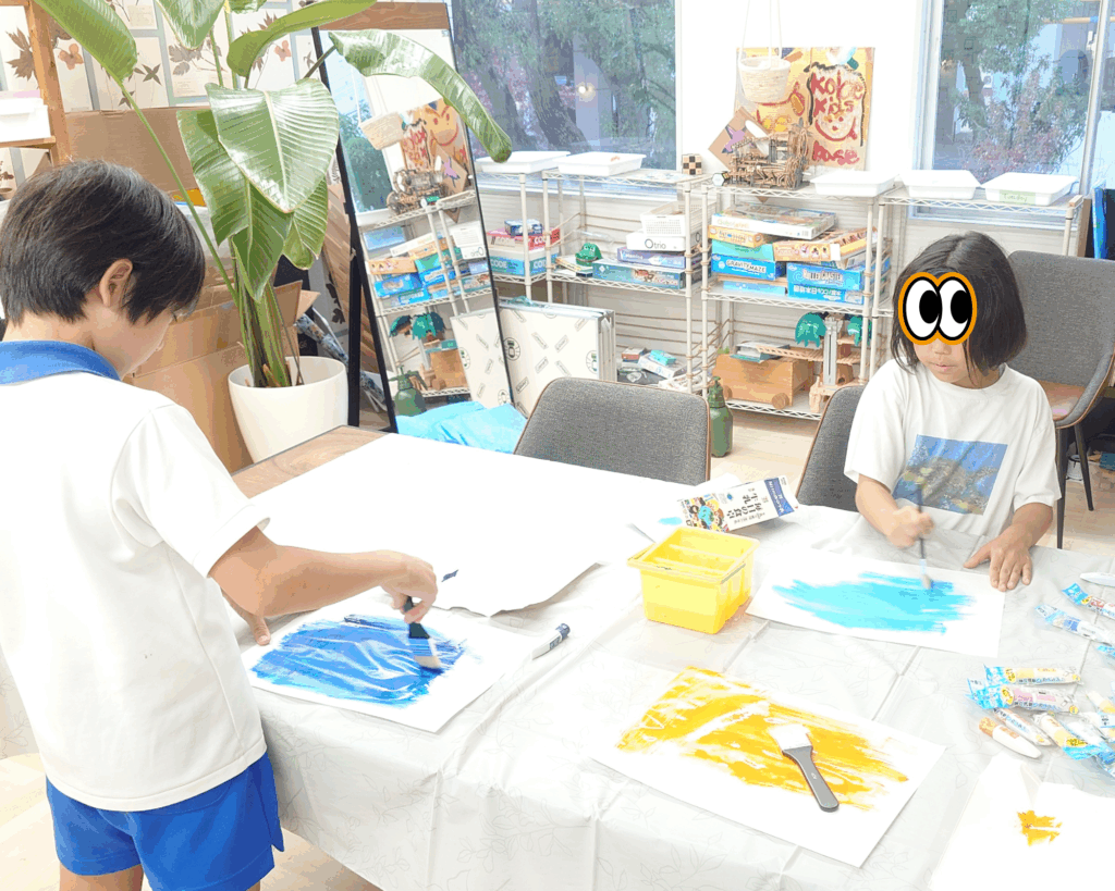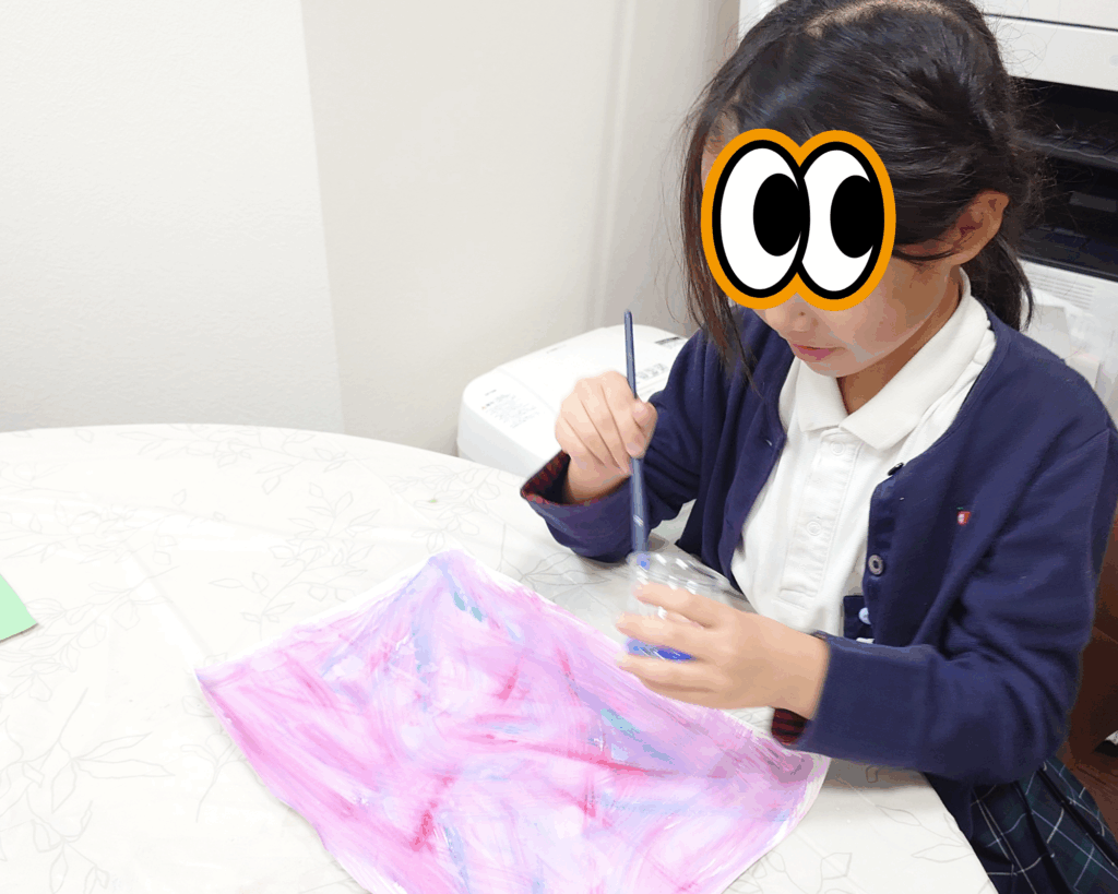 ふだん絵を描くことが苦手な子も、この方法だと上手下手とかも気にせず、色の混ざり具合を楽しんだり、名前も付けにくい色を楽しんだりできるので、もっともっと広い意味でのArtを楽しめると思います♪