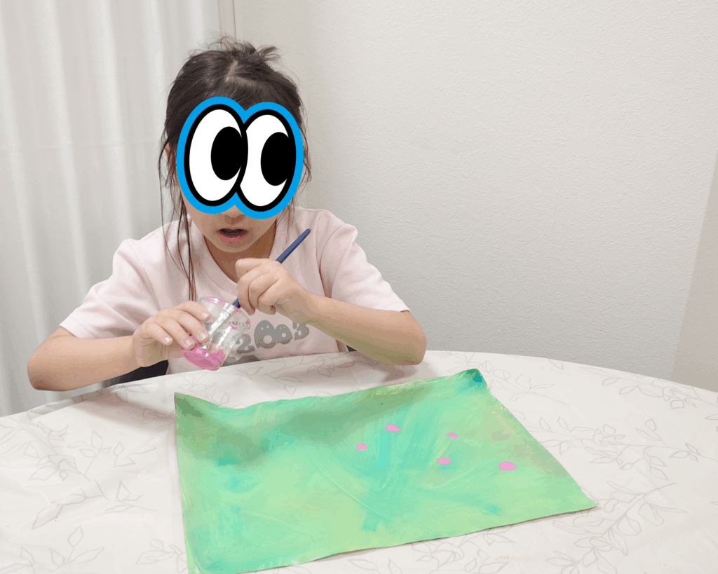 ゴールドの絵具が基本色と混ざるとところどころキラキラする様子や、ゴールドを入れると茶色になったりする様子が楽しかったよう。