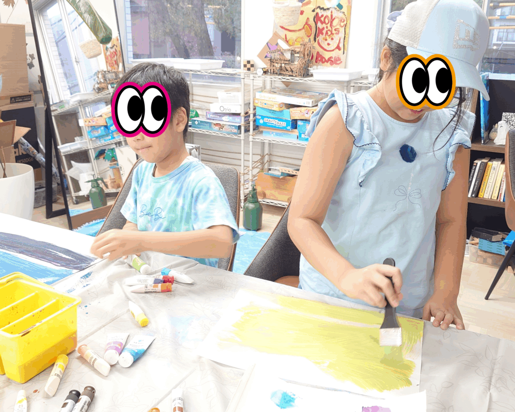 ふだん絵を描くことが苦手な子も、この方法だと上手下手とかも気にせず、色の混ざり具合を楽しんだり、名前も付けにくい色を楽しんだりできるので、もっともっと広い意味でのArtを楽しめると思います♪