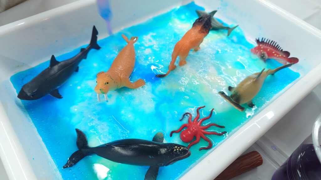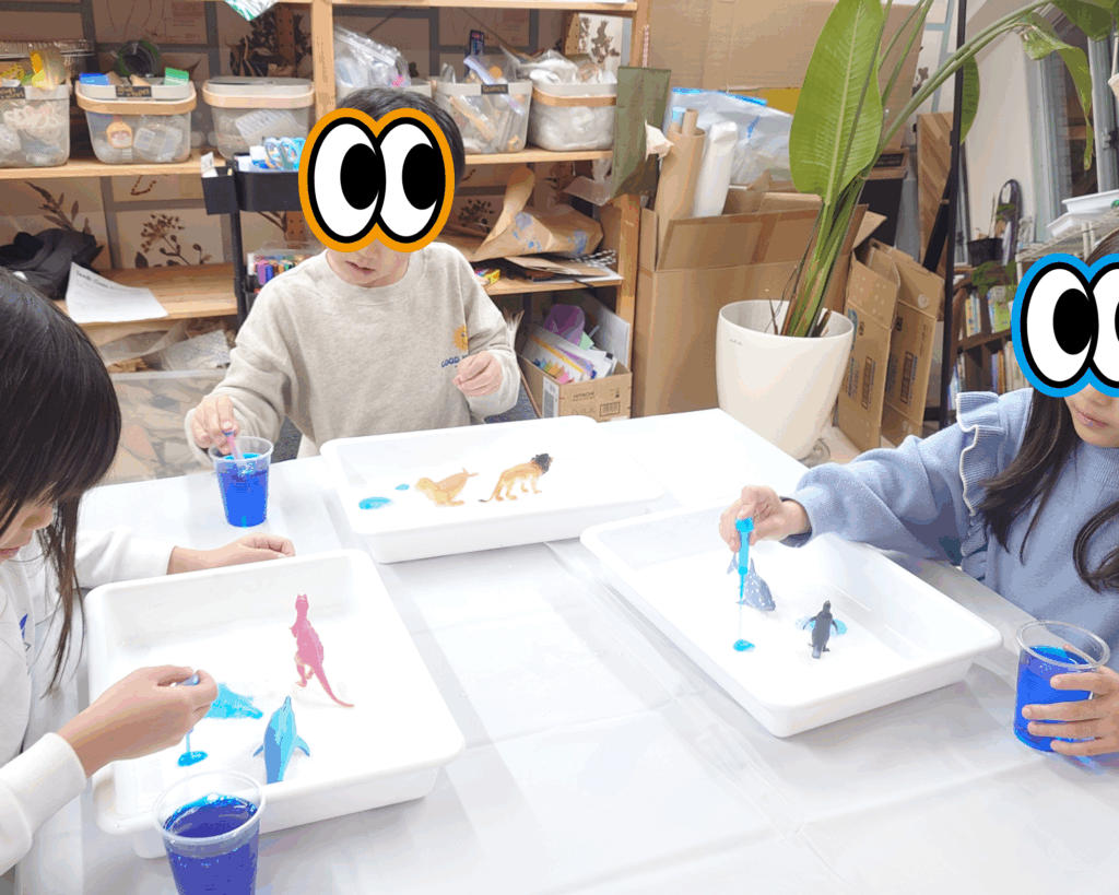 このクラスがよく遊ぶ動物フィギュアを英語でなんというか練習しながら入れて、スポイトで色水を入れて海の世界を作っていました。
