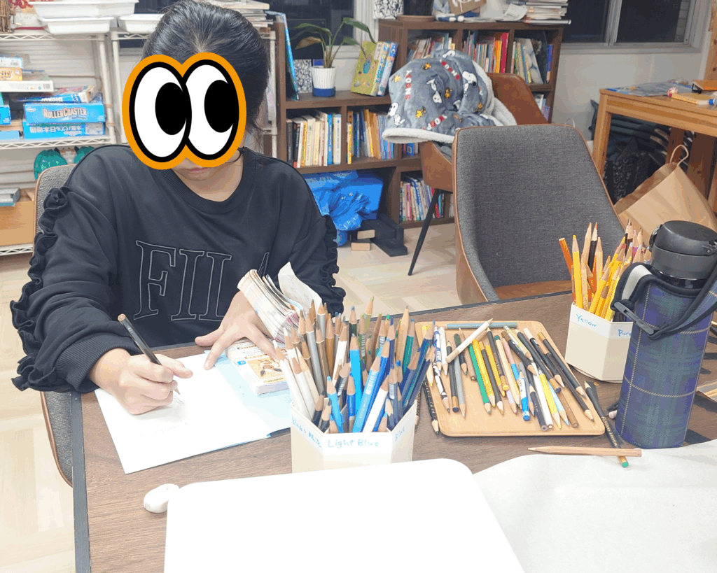 本の作成中も、What!?や、紙,please.と、わかる範囲で自然と英語が出てくる子ども達。