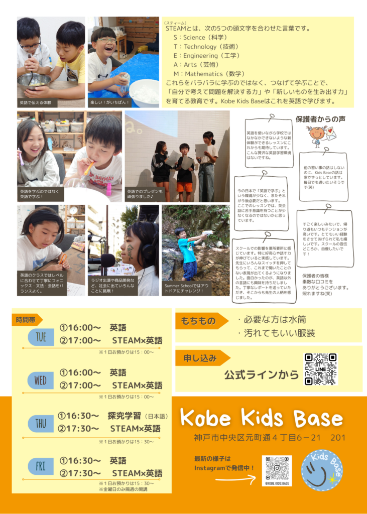 Kobe Kids Baseでは、探究学習、STEAM×英語、アウトドア学習の3本柱で、子ども達にグローバルな視点を持てるよう教育を提供しております。