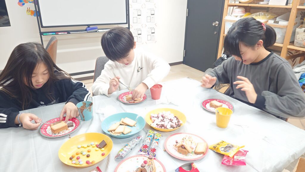 みんなで英語だけのゲームをしながらお菓子のお家づくりを♪