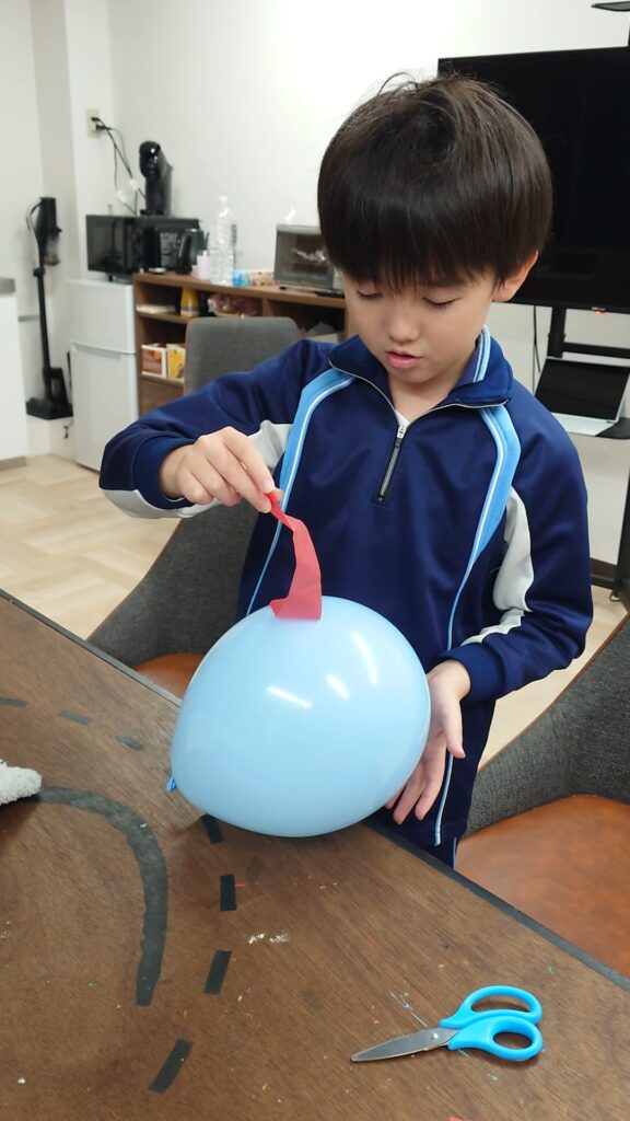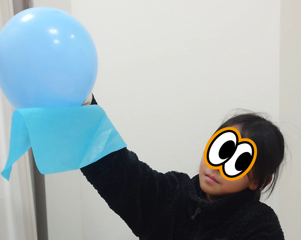 そして、花紙を浮かす実験では、初めて花紙で風船を浮かせられるかを試してました。